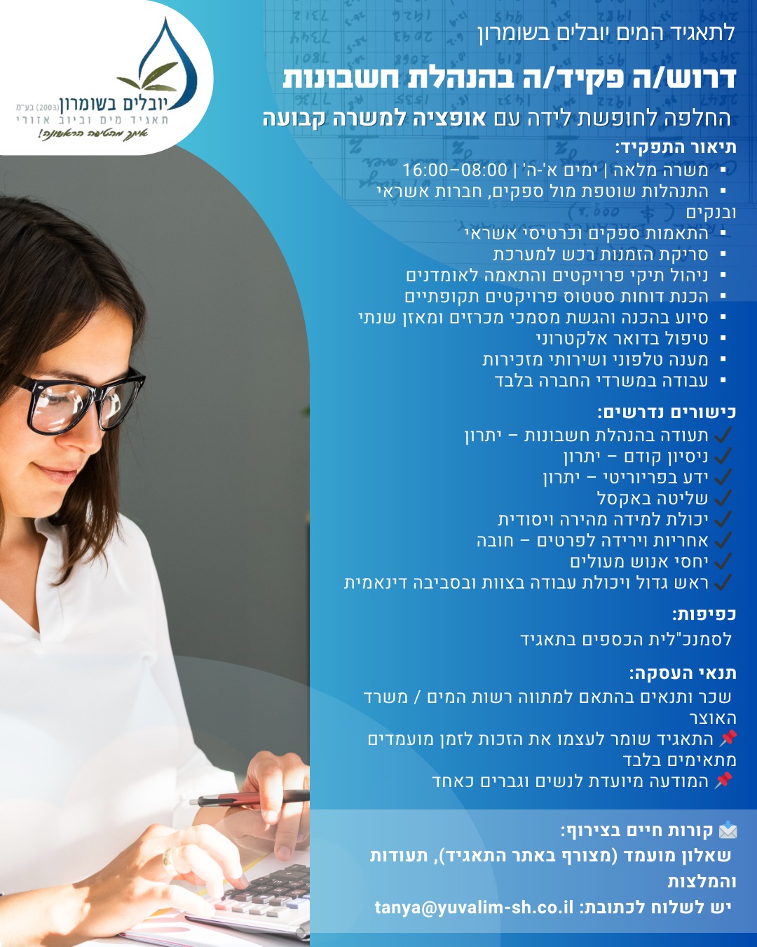 מודעת דרושים לפ.הנהלת חשבונות מילוי מקום לחופשת לידה עם אופציה למשרה קבוע במשרדי התאגיד